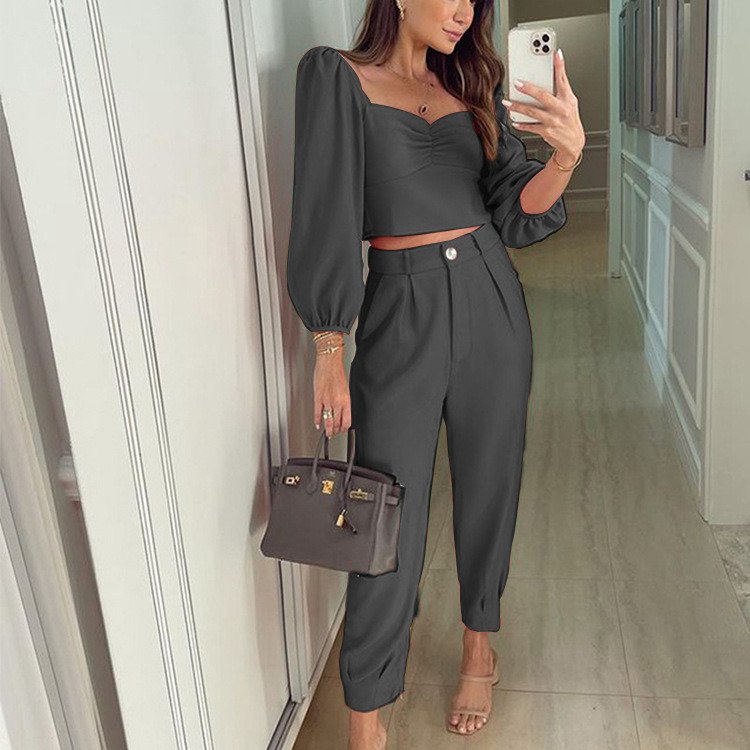 Spring Autumn Short Top Trousers 2 Piece Set Women Casual Sportswear Suit Square Collar Slim Fit Loose Solid Fashion Streetwear